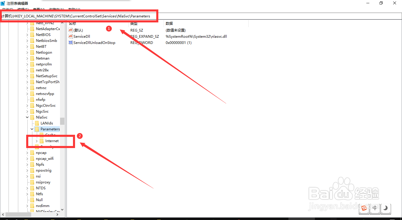 3/5打开注册表编辑器界面,依次打开【HKEY_LOCAL_MACHINE\SYSTEM\CurrentControlSetervices\NlaSvc\Parameters\Internet】文件夹。