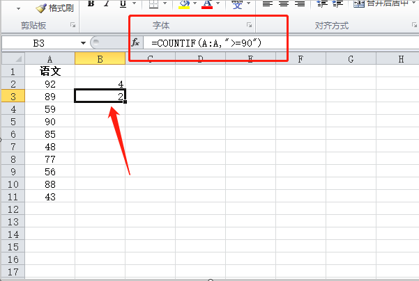 3、一样,假如要统计90分以上的人数,那么条件参数换成=90则可。