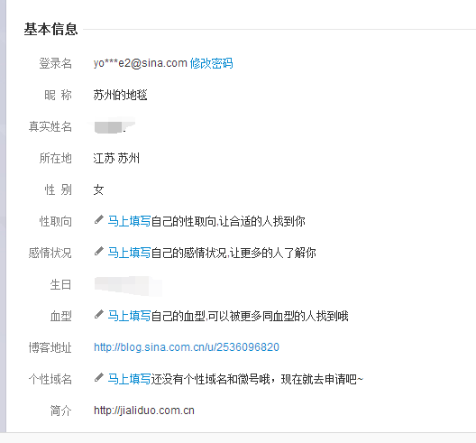 2、通过新浪微博进入,点击自己的基本信息,如果你开通了博客,里面会有你的博客地址。