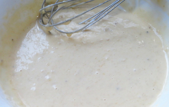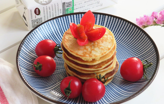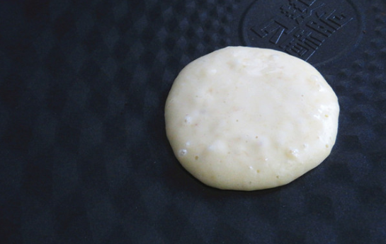 第八步:不粘锅预热,将面糊用勺子舀着,垂直从一个点倒下,面糊会在锅中自然流动成圆形。