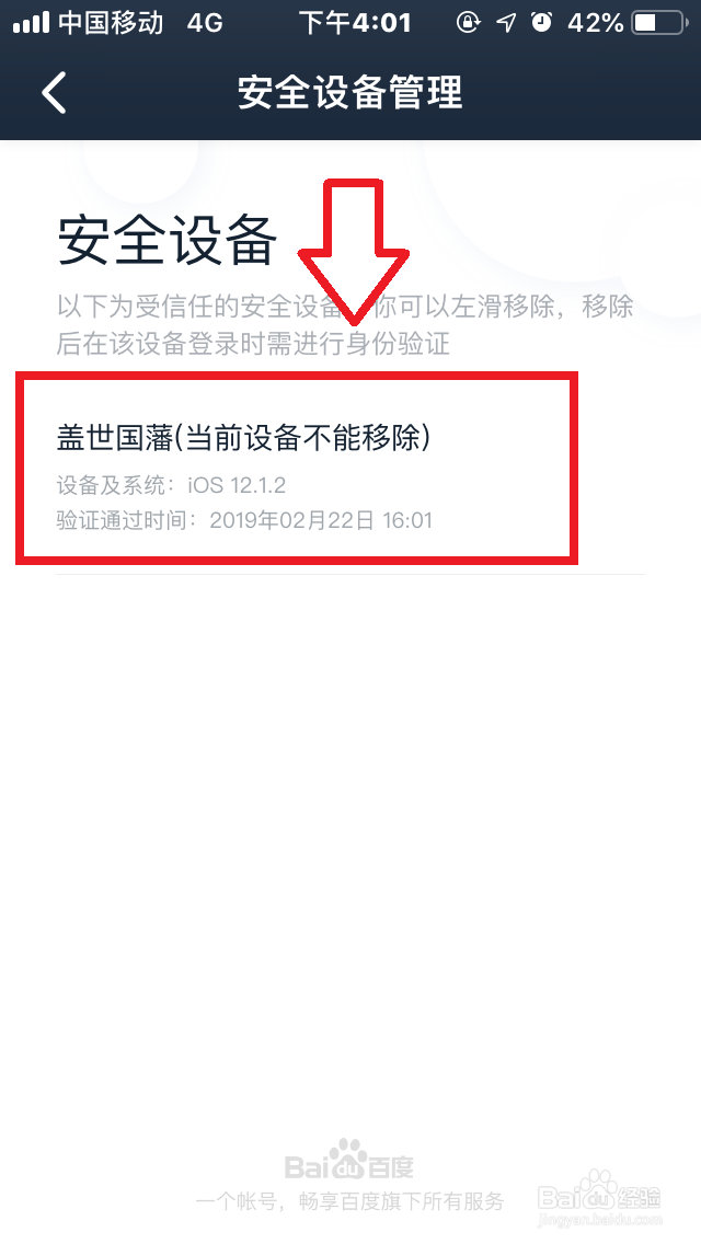 注意事项进入“安全设置”,点击“安全设备管理”,左滑移除风险设备即可。