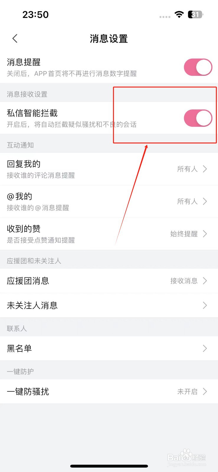 最后,在此界面点击开启【私信智能拦截】功能开关,这样即可打开b站拦截骚扰私信功能了。