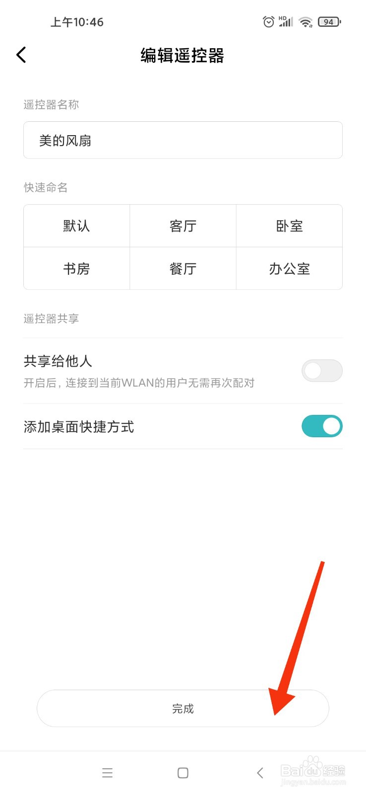 点击添加风扇遥控器,如下图,点击完成,吊扇遥控器怎么配对,这样就可以遥控器风扇配对了