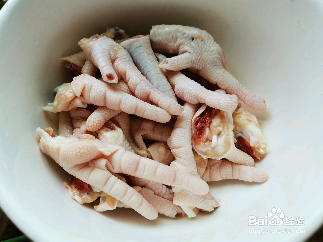 锅中放水,放入鸡爪,葱、姜、料酒,适量盐煮开10分钟,凉水冲洗沥干备用