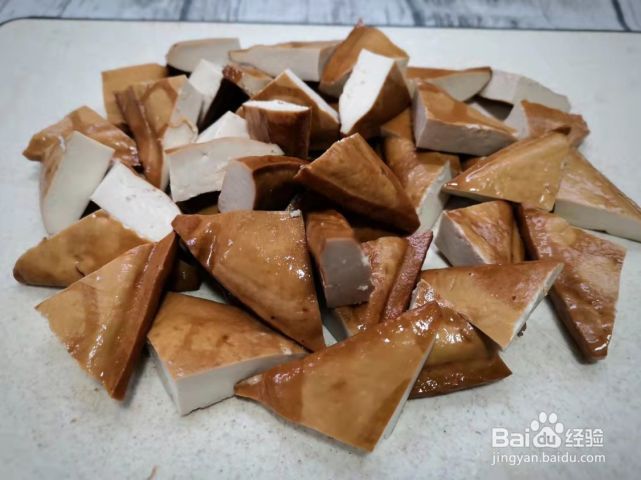 把豆腐片冲洗后,切成三角形,随意切成块都行。