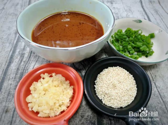碗中加入各种调味料,最后倒入清水搅拌稀释,再切点葱花。