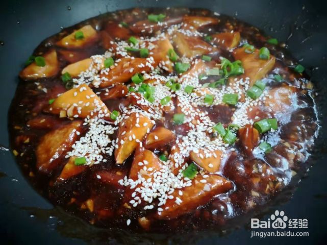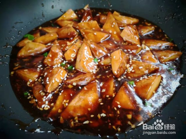 糖醋汁倒入锅中,倒入煎好的豆腐块,转中火焖1分钟