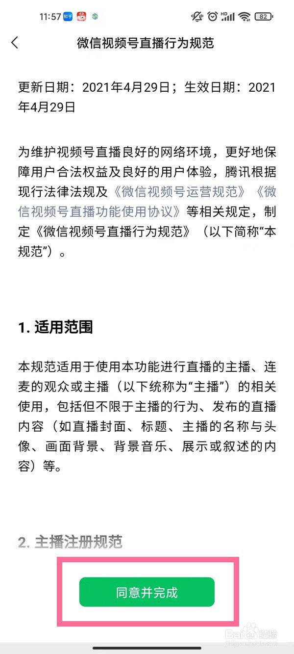 同意【直播协议】,阅读【行为规范】,点击【同意并完成】即可。