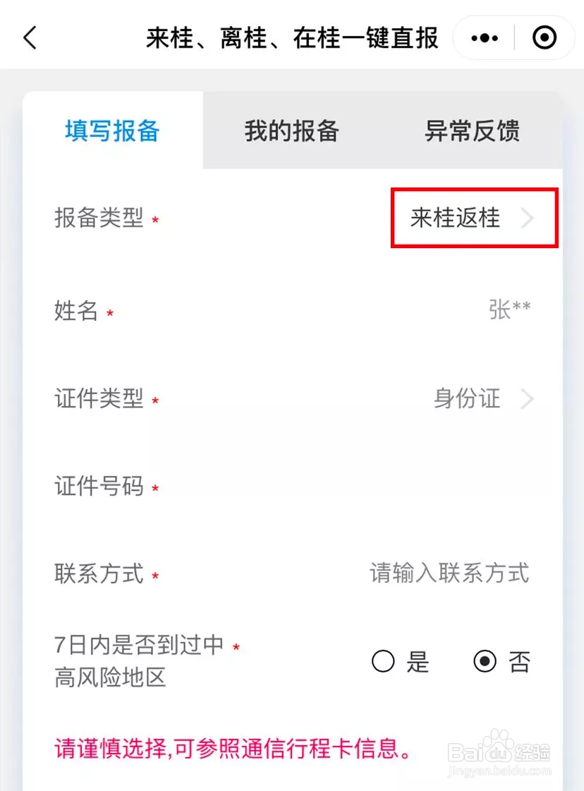 第二步,选择报备类型为【来桂返桂】,填写姓名、身份证号码、联系方式、住址等信息