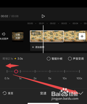 向左滑动变速调节的小滑块,低于1倍的速度就是变慢速度,点击右下角打钩符号即可。