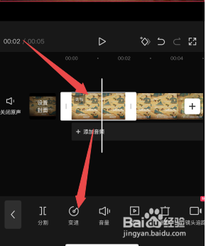 视频就会分为两段,点击选择需要设置慢动作的这一段视频,点击“变速”。