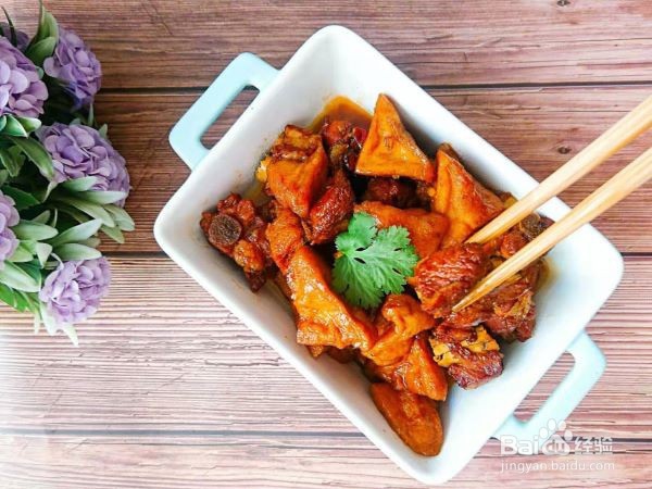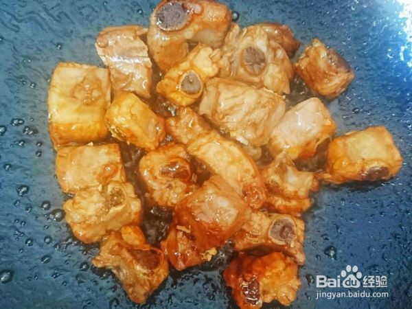 热锅倒油,把冰糖放下去小火慢慢炒出焦糖色,然后倒入焯过的排骨翻炒几下。