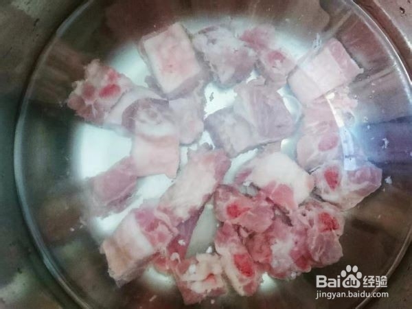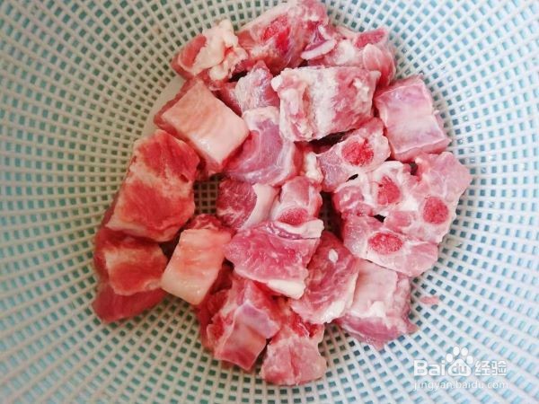 将排骨冷水入锅,水开后,瓢去浮沫,然后把排骨捞出,控干水份。
