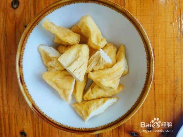 油豆腐对半切开。(油豆腐切开烹饪会比较方便入味)