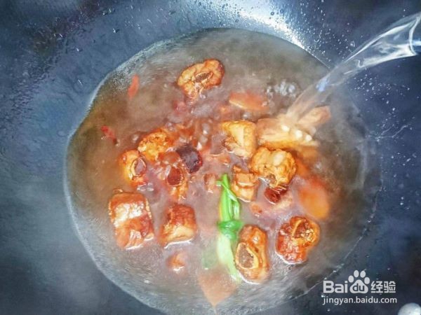 倒入没过食材的热水,盖上盖子,大火煮开3分钟后,转小火炖20分钟,然后下入切好的油豆腐,继续炖煮20分钟,出锅前撒一点食盐,大火收汁,翻炒均匀后即可。