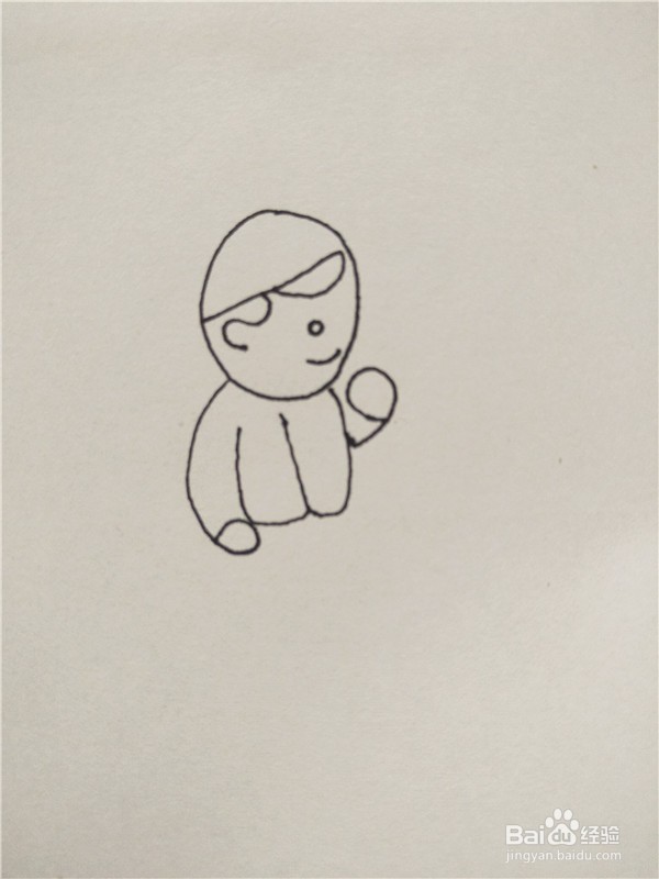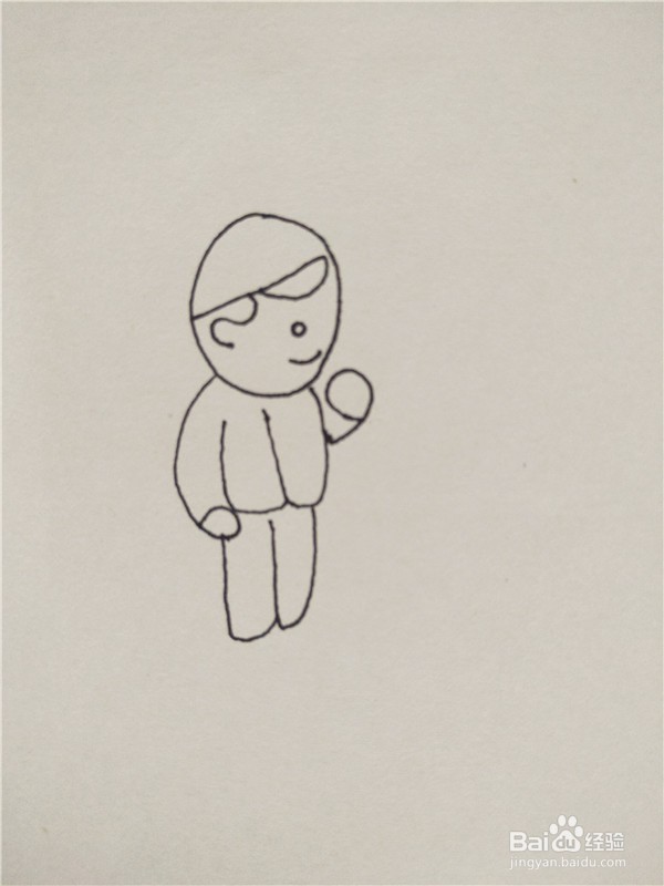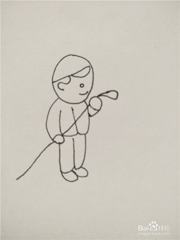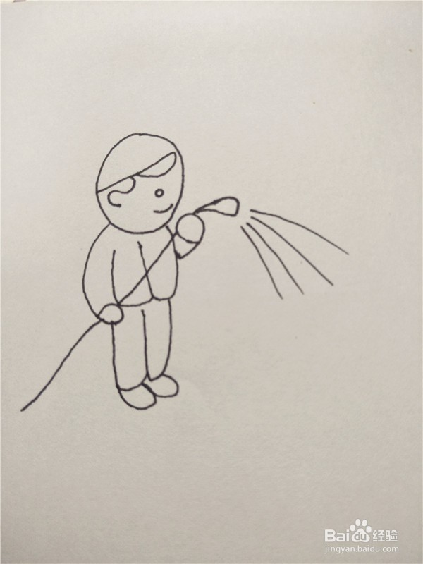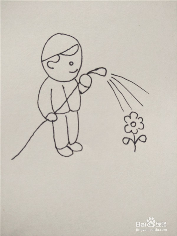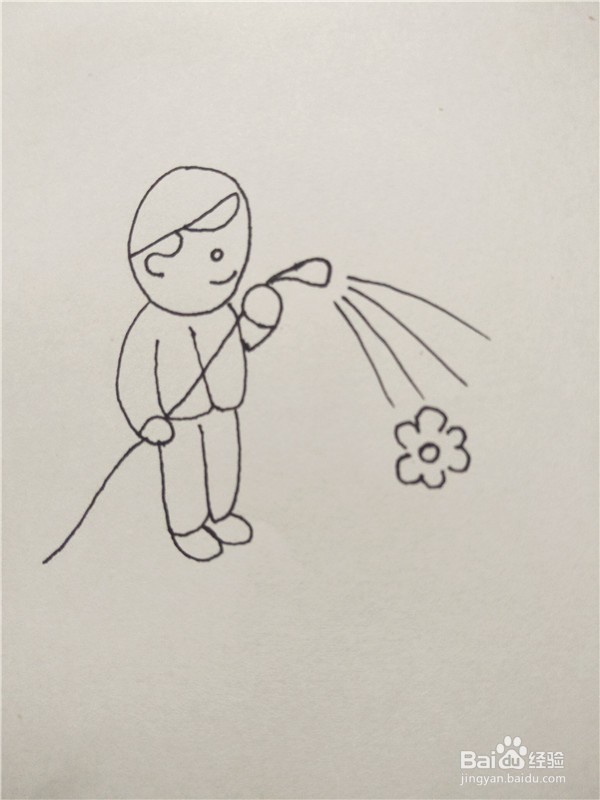 在他的身体中间,从左下角向右上角画一个9,表示浇花的管子和喷头。