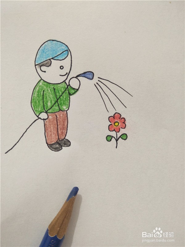 最后,小朋友们用彩笔涂上自己喜欢的颜色,有趣又好看的园丁浇花就画好了。