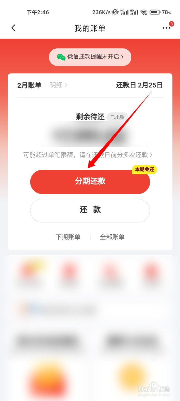 在当月该还的款项右侧,点击账单分期的选项。
