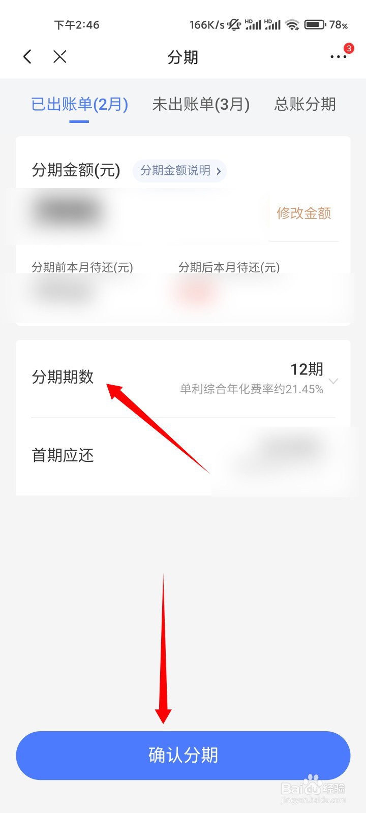 选择分期期数,点击确认分期的按钮即可。