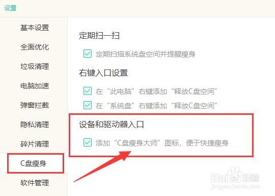 进入“C盘瘦身”界面中,在“设备和驱动器入口”项下,勾选“添加"C盘瘦身大师”图标,便于快捷瘦身”即可,如图所示。