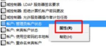 找到“账户:管理员状态”,这时我们可以看见状态为“已禁用”,我们需要将它开启,右键点击“账户:管理员状态”,在弹出的菜单中选择“属性”选项,