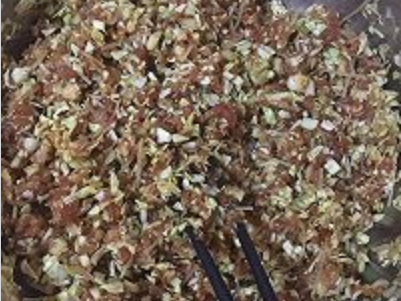 2、白菜叶、猪肉、粉条、豆腐剁碎,攥干水分后放入馅中拌匀后加入蚝油、生抽、味精、香油、葱末拌匀即可。