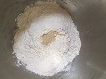 1、超市买的自发粉,不用添加酵母。把面粉、温水和酵母倒入厨师机,揉成光滑的面团。放在温暖处发酵至两倍大。