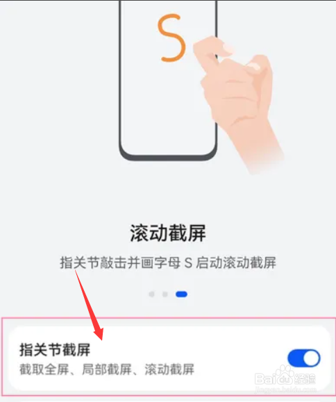 最后打开【指关节截屏】右侧开关,只需要用单指指关节在屏幕同一位置连续敲击两下即可截屏。