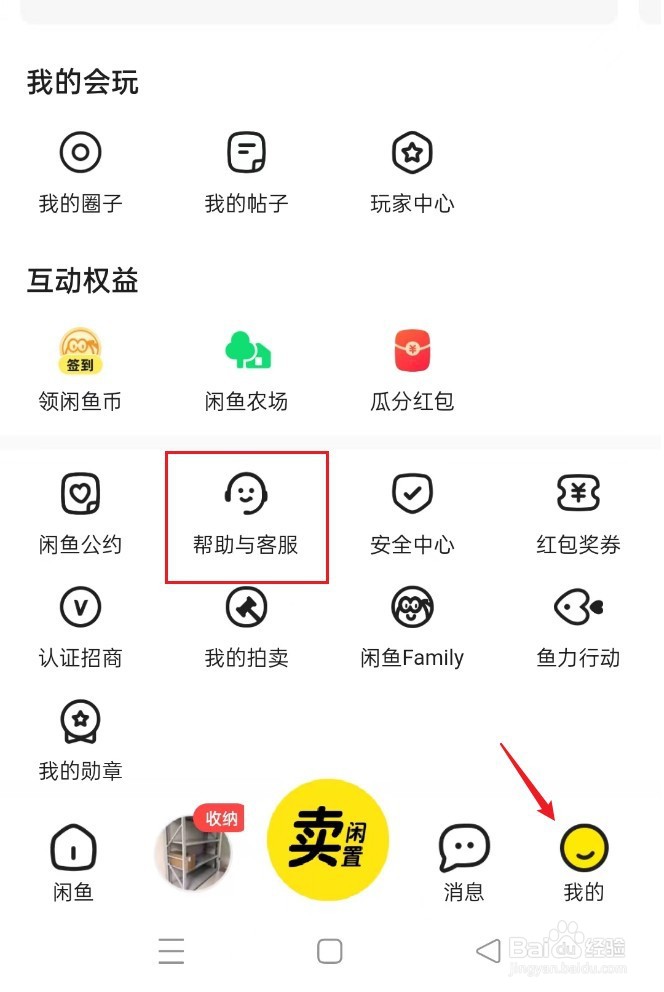 打开闲鱼,进入我的页面,点击帮助和客服。
