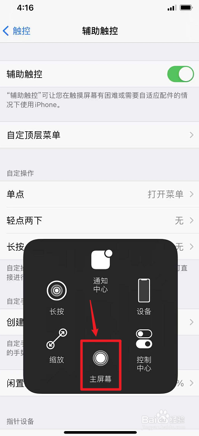 在iPhone设置软件中,可以通过在辅助功能界面,在触控那里,打开辅助触控,选择主屏幕实现。