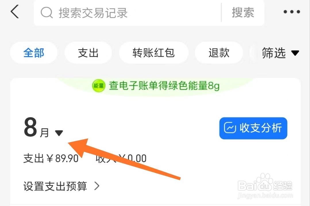点击后,进入账单界面,点击箭头所指的三角形符号,即可根据需求查询支付宝的月账单了!