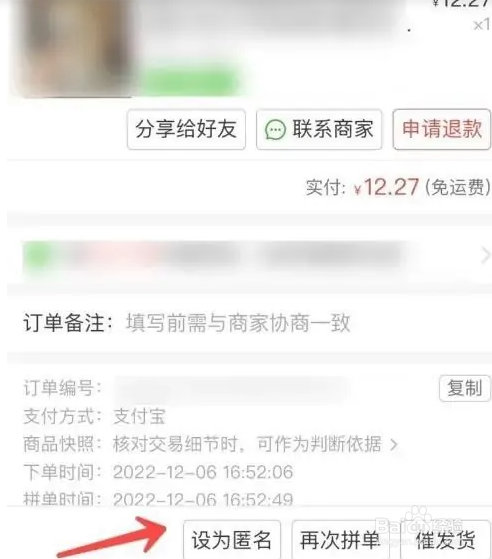 步骤三,在订单详情下方点击【设为匿名】即可