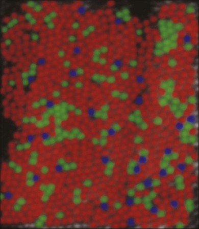 上图显示了三种视锥细胞的分布情况。可以明显看出红色和绿色明显要大于蓝色细胞的数目。