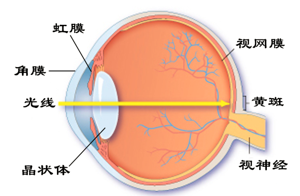 为了便于理解,我将晶状体比作相机的镜头,将视网膜比作相机的底片。外界光线通过角膜,并通过晶状体(镜头)的焦距调节功能使光线不偏不正的落在视网膜(底片)上。