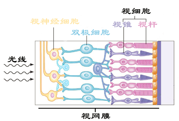 如上图所示,光线在落在视网膜后,首先会激活位于后方的视锥细胞和视杆细胞,被激活的细胞会将所见的图像信息向前通过双极细胞传至视神经细胞。最后由视神经细胞将信号传递给大脑,大脑通过处理之后我们就可以感觉到外界的画面了。