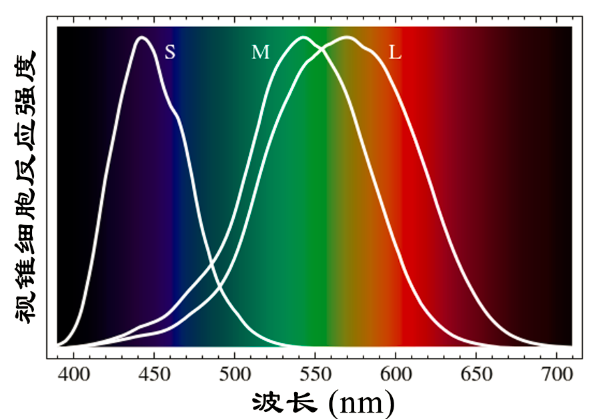 上图显示了蓝色(S),绿色(M)和红色(L)视锥细胞在不同波长时的激活程度。比如波长在430-450nm的蓝光可以最大限度的激活蓝色视锥细胞。