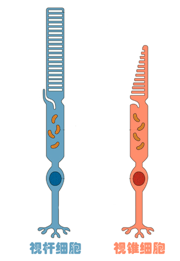 哺乳动物的视网膜包含两种视细胞,负责白天彩色视觉的被称为视锥细胞,负责夜间非彩色视觉的被称为视杆细胞。对于我们日出而作、日落而息的人类来说,虽然夜间视觉相对不是很重要,但是视杆细胞的数量却占据了所有视细胞总数的95%(约一亿个),而视锥细胞仅仅占5%(约五百万个)。在夜间处于主导地位的视杆细胞只有一种,但是支持彩色视觉的视锥细胞可以被细分为三种:蓝色(S),绿色(M)和红色(L)视锥细胞。他们分别对波长为430,530以及561nm的光线最为敏感。