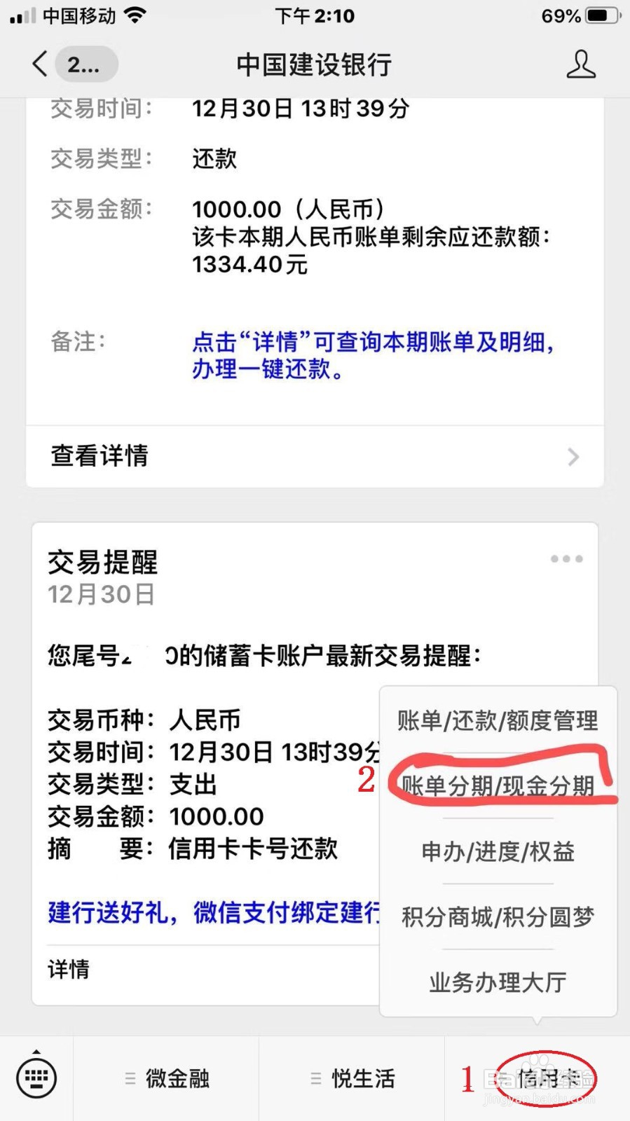 关注“中国建设银行”微信公众号,绑定信用卡,依次点击“信用卡-账单分期-点击这里,申请账单分期”