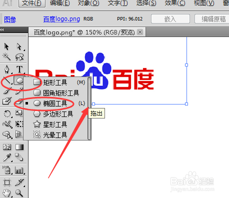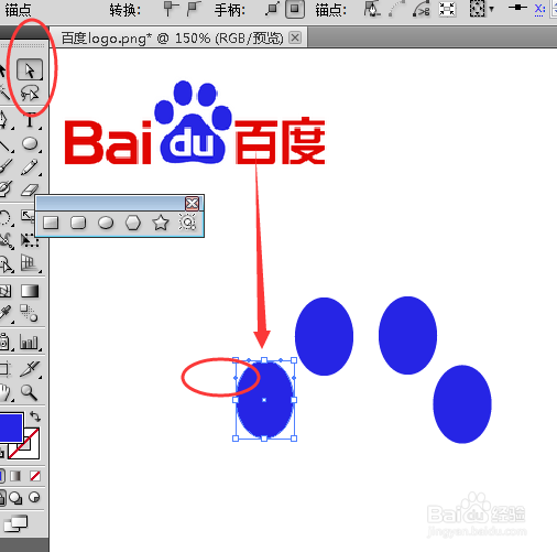 然后我们开始绘制百度logo中最复杂的部分——猫爪,先选择旁边工具栏中的椭圆工具在画板上画四个椭圆,并使用吸管工具填色,