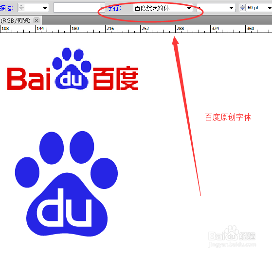 最后我们就可以在上面填字了,在此我必须强调一下,大家在使用字体是可以选择自己喜欢并且适用的字体,但是百度logo中的字体是百度爱好者团队原创的——百度综艺简体字,喜欢的可以去网上下载这个字体包。