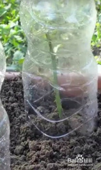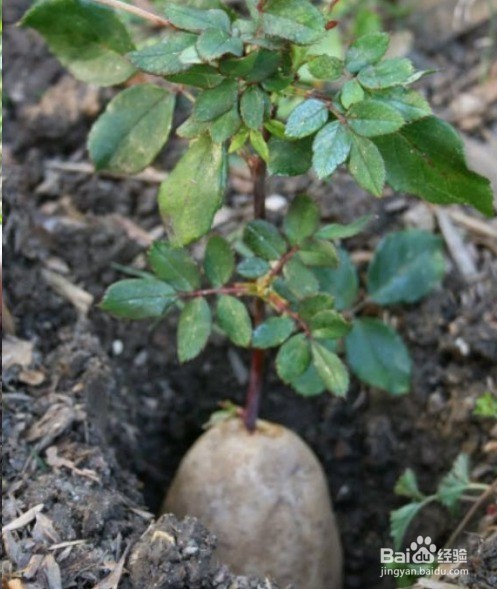 把土豆埋入花盆里,在玫瑰上面罩上去掉瓶口的矿泉水瓶