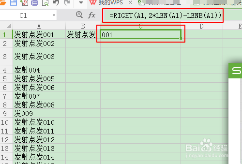然后在第二个单元格的位置输入函数=RIGHT(A1,2*LEN(A1)-LENB(A1))用于取数字
