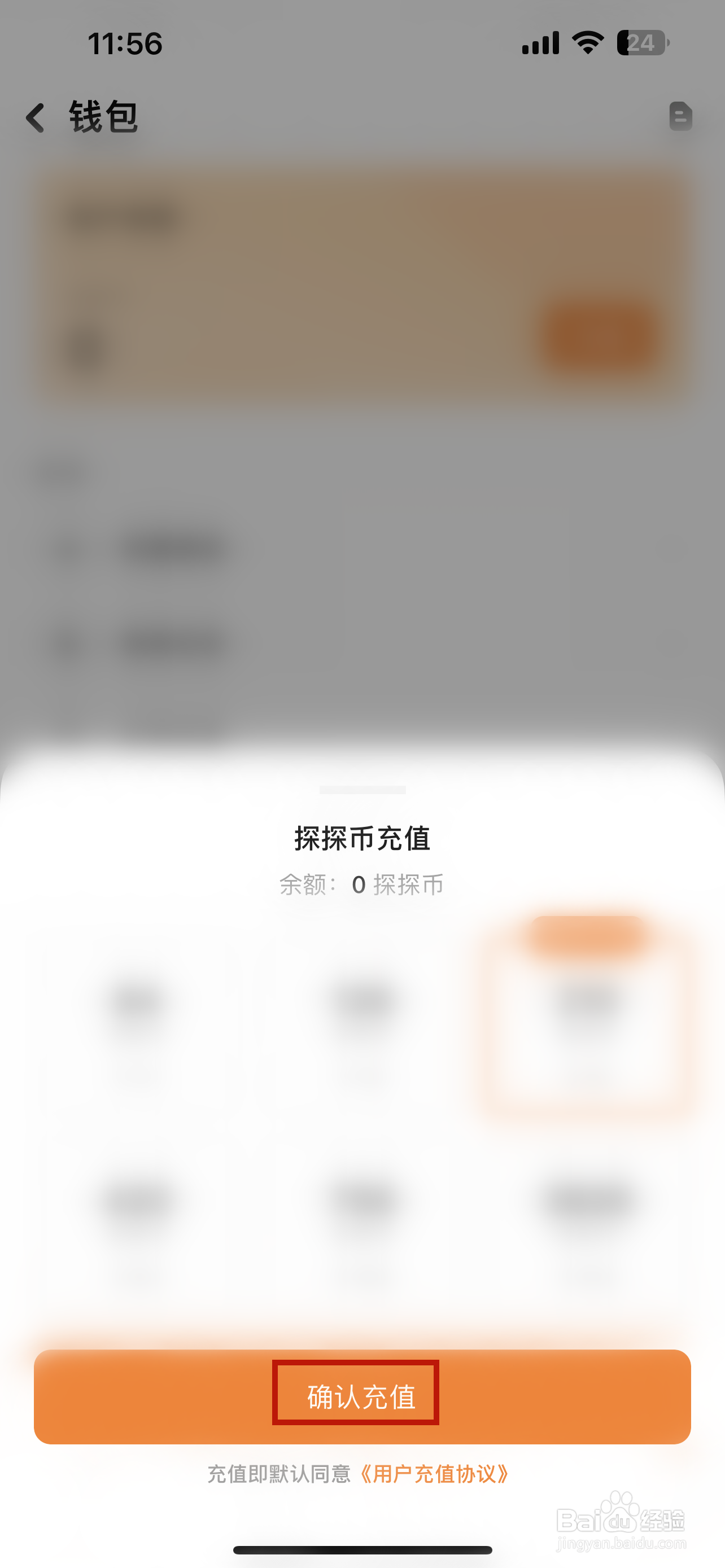 打开探探币充值的面板选择金额后点击确认充值按钮。