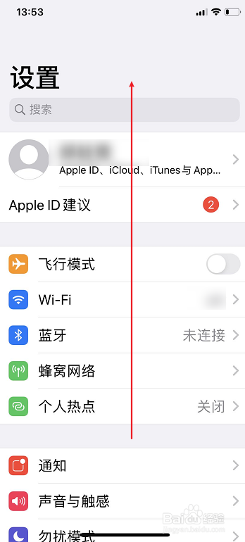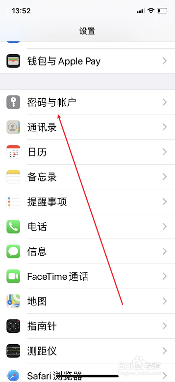 打开设置页面后,上滑滚动页面找到【密码与帐户】