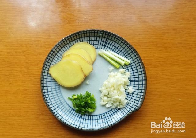 然后再准备一些辅料,把生姜洗净切片,大蒜去皮切成蒜粒,香葱洗干净后,葱白部分切段,葱叶切成葱花