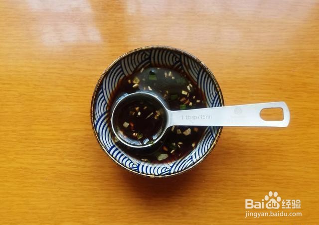 蒸虾子的时候,我们来做调料汁,将葱花、蒜粒、1勺生抽、1勺蚝油、1勺芝麻香油、3勺香醋倒入蘸料碟内,搅拌均匀即可