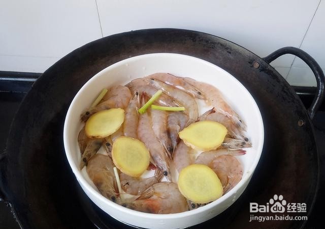 待锅内水沸腾后,放一个蒸架,把基围虾送入锅中,然后把姜片和葱白铺在虾子的表面,盖上盖子,转中火蒸8分钟,关火后再焖2分钟,就可以出锅了