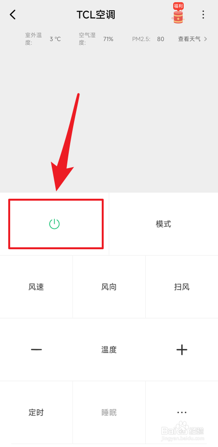 进入TCL空调遥控器界面后,点击【开关】按键。