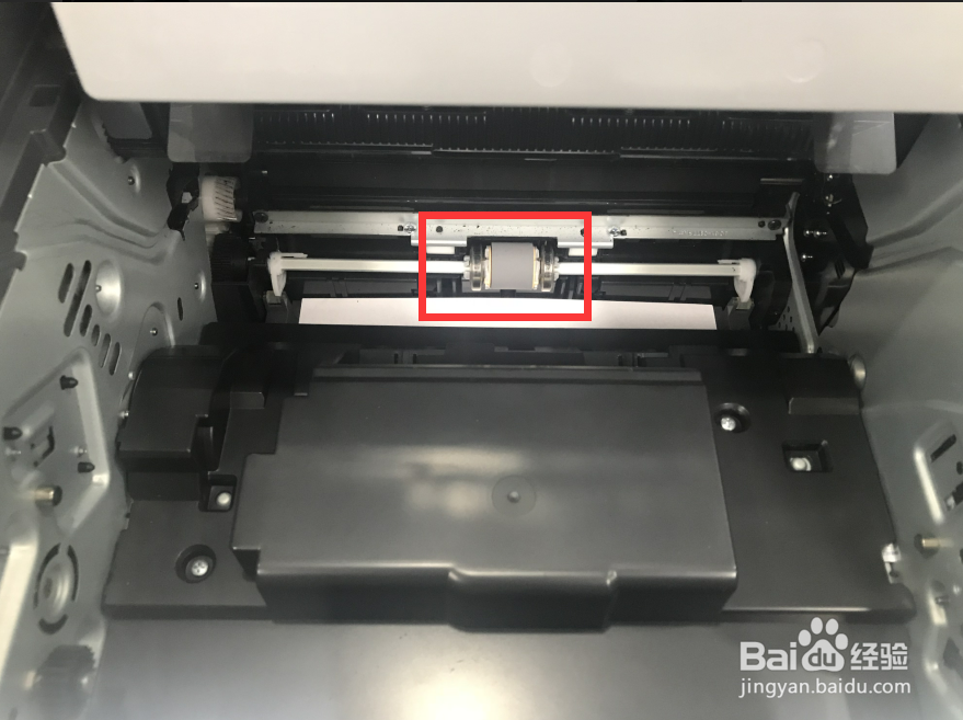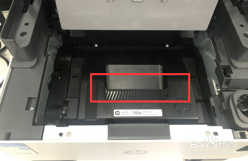 打开硒鼓舱门该后,即可看到打印机硒鼓,如图位置即为打印机硒鼓把手。