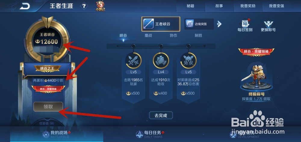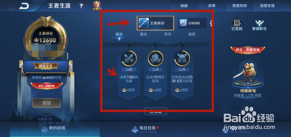 我们可以通过王者峡谷里面的升级任务,来获得积分,我玩了不到200局,就差4400积分了,所以基本上250局以内就能获得这个称号。